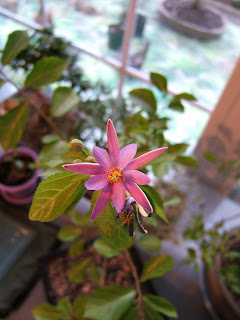 Many of our bonsais seem happy wintering indoors. The Grewia keeps putting out blooms and the Barbados cherry still has its juicy looking cherry.